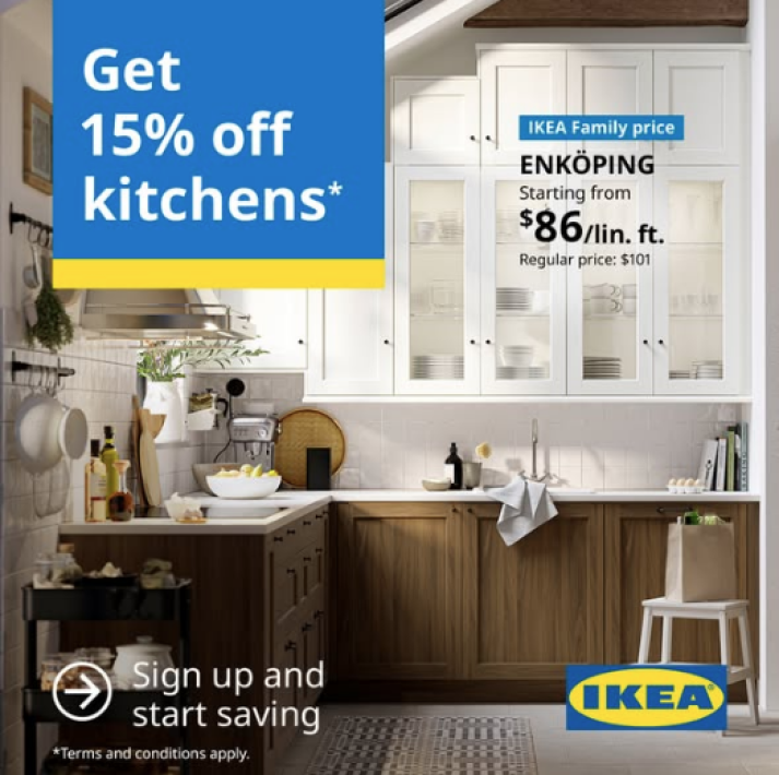 IKEA Family members receive 15% back in IKEA gift cards on kitchen purchases over $1,500 and receive 10% back in IKEA gift cards on IKEA kitchen installation services.